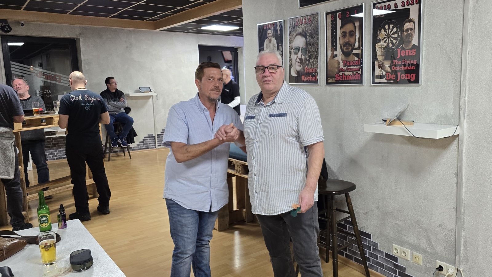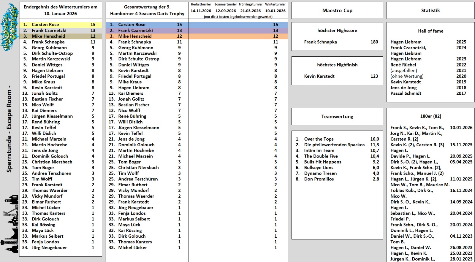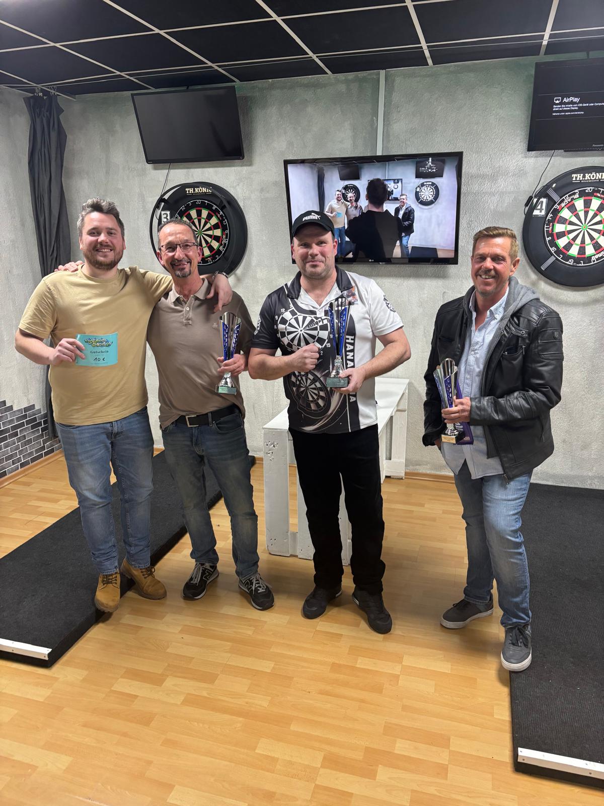 Herzliche Glückwünsche, Pokale und Gutscheine gehen an die Erstplatzierten Carsten, Frank und Mike, sowie an den High-Finisher Kevin. Ganz nebenbei verbuchten 7 verschiedene Spieler im Laufe des Turniers den allseits ersehnten Top-Score von 180 Punkten.